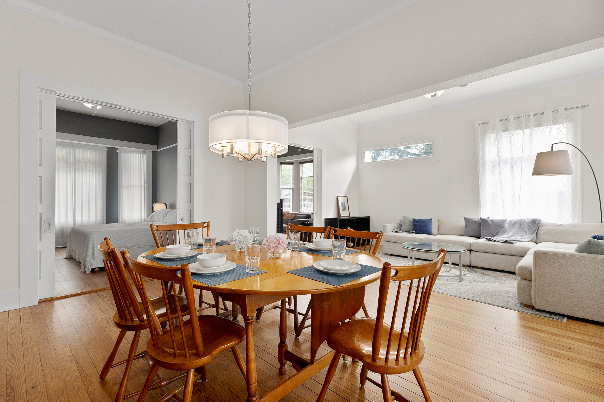 Sunlit living + dining: Original hardwoods, French doors with transoms, cozy seating and a round dining table—perfect for lingering breakfasts and late-night conversations.